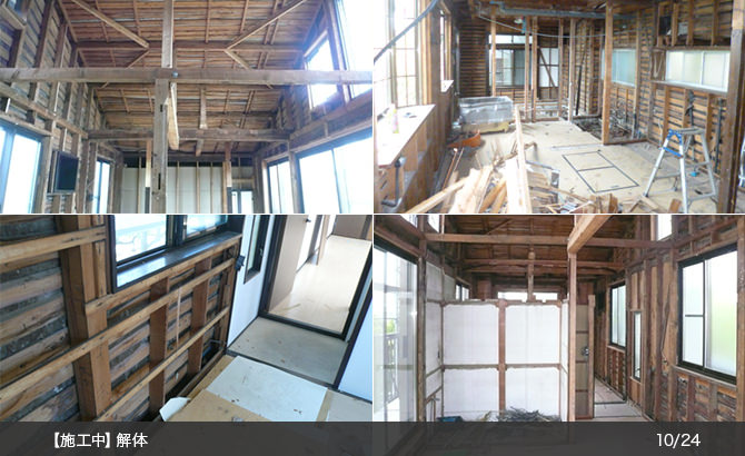 解体中屋根が落ちてくるのでは?!とハラハラ・・・急遽大工さんに仮の柱を立ててもらいその場をしのぎました。内部を解体してみたら外壁に筋かいがほとんど入っておらず大工さんに補強してもらいました。