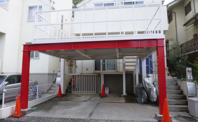 遠くから見ても目に入るレッドの柱、ホワイトのフェンス、更にブラックの床材という独特の色合いはとてもスタイリッシュですね!