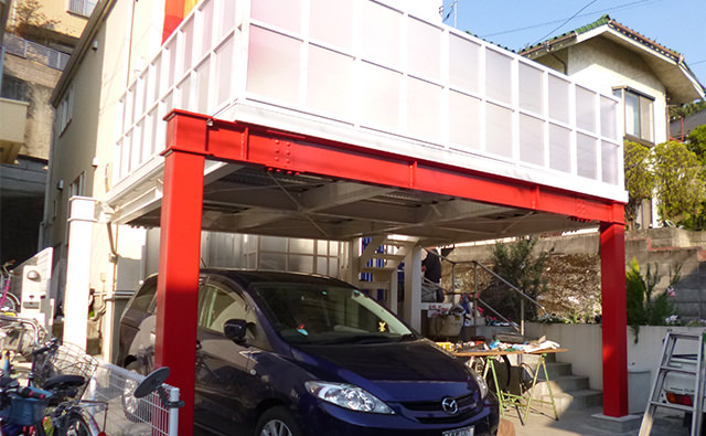 フェンスにはポリカ―ボネート板という強化ガラスの150倍の強度があるプラスチックをつけました。また、自己消化性も備えていて災害時にも安心、更に日常生活では周囲からの視線も防げます。