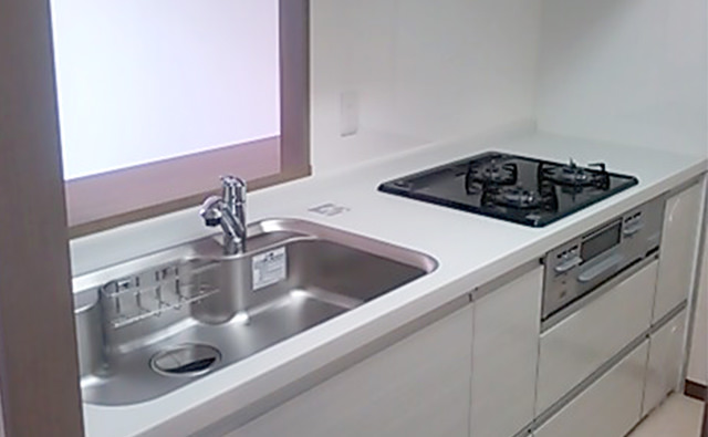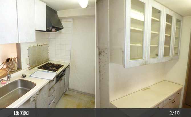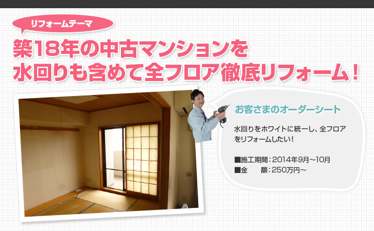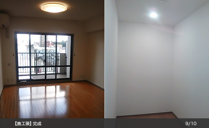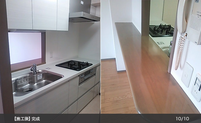 1か月でここまで綺麗になりました!ピカピカのフローリングと壁紙で室内はすっかり明るく。真っ白のキッチンを新設し、お客様のご希望通り清潔感あふれる水回りに変身。バスルームはドアと水栓、風呂釜部分のみを交換で予算を削減しました。